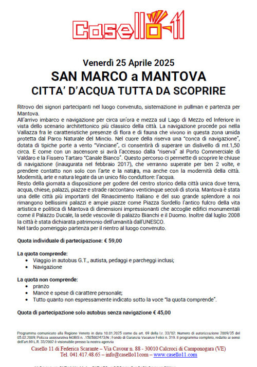 Ritrovo dei signori partecipanti nel luogo convenuto, sistemazione in pullman e partenza per Mantova. All’arrivo imbarco e navigazione per circa un’ora e mezza sul Lago di Mezzo ed Inferiore in vista dello scenario architettonico più classico della città. La navigazione procede poi nella Vallazza fra le caratteristiche presenze di flora e di fauna che vivono in questa zona umida protetta dal Parco Naturale del Mincio. Nel cuore della riserva una “conca di navigazione”, dotata di tipiche porte a vento “Vinciane”, ci consentirà di superare un dislivello di mt.1,50 circa. E come con un ascensore si avrà l’accesso dalla “riserva” al Porto Commerciale di Valdaro e la Fissero Tartaro “Canale Bianco”. Questo percorso ci permette di scoprire le chiuse di navigazione (inaugurata nel febbraio 2017), che verranno superate per ben 2 volte, e prendere contatto non solo con l’arte e la natura, ma anche con la modernità della città. Modernità, arte e natura legate da un unico filo conduttore: l’acqua. Resto della giornata a disposizione per godere del centro storico della città unica dove terra, acqua, chiese, palazzi, piazze e strade raccontano venticinque secoli di storia. Mantova è stata una delle città più importanti del Rinascimento Italiano e del suo grande splendore a noi rimangono bellissimi palazzi e ampie piazze come Piazza Sordello l'antico fulcro della vita artistica e politica di Mantova di dimensioni impressionanti che accoglie edifici monumentali come il Palazzo Ducale, la sede vescovile di palazzo Bianchi e il Duomo. Inoltre dal luglio 2008 la città è stata dichiarata patrimonio dell'umanità dall'UNESCO. Nel tardo pomeriggio partenza per il rientro al luogo convenuto.