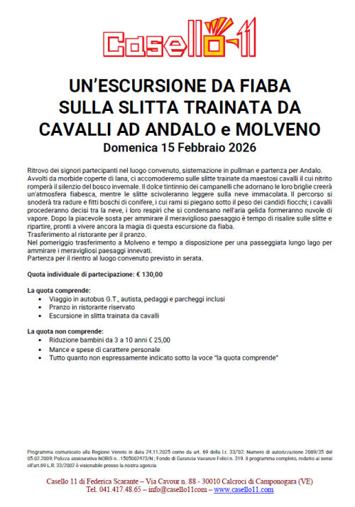 Avvolti da morbide coperte di lana, ci accomoderemo sulle slitte trainate da maestosi cavalli il cui nitrito romperà il silenzio del bosco invernale. Il dolce tintinnio dei campanelli che adornano le loro briglie creerà un'atmosfera fiabesca, mentre le slitte scivoleranno leggere sulla neve immacolata. Il percorso si snoderà tra radure e fitti boschi di conifere, i cui rami si piegano sotto il peso dei candidi fiocchi; i cavalli procederanno decisi tra la neve, i loro respiri che si condensano nell'aria gelida formeranno nuvole di vapore. Dopo la piacevole sosta per ammirare il meraviglioso paesaggio è tempo di risalire sulle slitte e ripartire, pronti a vivere ancora la magia di questa escursione da fiaba. Trasferimento al ristorante per il pranzo. Nel pomeriggio trasferimento a Molveno e tempo a disposizione per una passeggiata lungo lago per ammirare i meravigliosi paesaggi innevati.