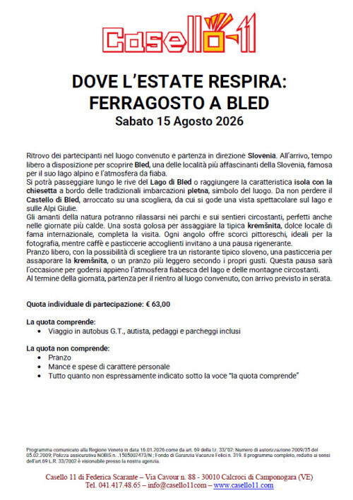 Ritrovo dei partecipanti nel luogo convenuto e partenza in direzione Slovenia. All’arrivo, tempo libero a disposizione per scoprire Bled, una delle località più affascinanti della Slovenia, famosa per il suo lago alpino e l’atmosfera da fiaba. Si potrà passeggiare lungo le rive del Lago di Bled o raggiungere la caratteristica isola con la chiesetta a bordo delle tradizionali imbarcazioni pletna, simbolo del luogo. Da non perdere il Castello di Bled, arroccato su una scogliera, da cui si gode una vista spettacolare sul lago e sulle Alpi Giulie. Gli amanti della natura potranno rilassarsi nei parchi e sui sentieri circostanti, perfetti anche nelle giornate più calde. Una sosta golosa per assaggiare la tipica kremšnita, dolce locale di fama internazionale, completa la visita. Ogni angolo offre scorci pittoreschi, ideali per la fotografia, mentre caffè e pasticcerie accoglienti invitano a una pausa rigenerante. Pranzo libero, con la possibilità di scegliere tra un ristorante tipico sloveno, una pasticceria per assaporare la kremšnita, o un pranzo più leggero secondo i propri gusti. Questa pausa sarà l’occasione per godersi appieno l’atmosfera fiabesca del lago e delle montagne circostanti. Al termine della giornata, partenza per il rientro al luogo convenuto, con arrivo previsto in serata.
