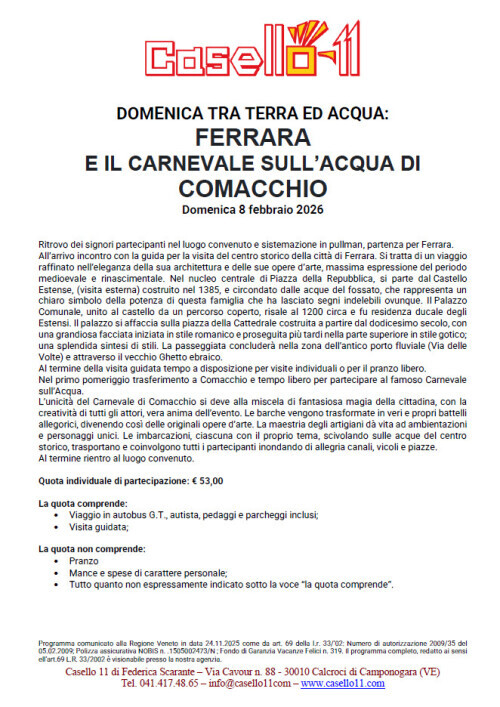 Partecipa a un affascinante viaggio a Ferrara, alla scoperta del suo elegante centro storico medievale e rinascimentale, tra Castello Estense, Cattedrale e vie suggestive. Proseguiremo poi verso Comacchio per vivere il magico Carnevale sull’Acqua, con le sue barche trasformate in spettacolari battelli allegorici. Un’esperienza ricca di arte, storia e colori.