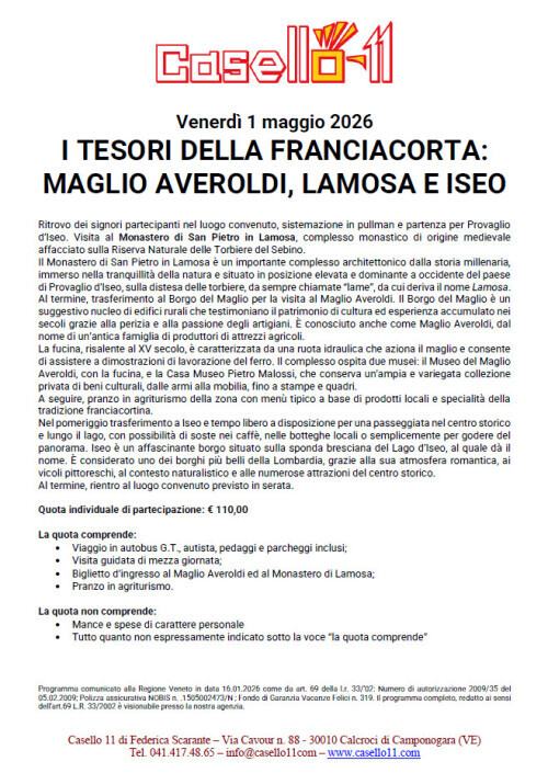 Ritrovo dei signori partecipanti nel luogo convenuto, sistemazione in pullman e partenza per Provaglio d’Iseo. Visita al Monastero di San Pietro in Lamosa, complesso monastico di origine medievale affacciato sulla Riserva Naturale delle Torbiere del Sebino. Il Monastero di San Pietro in Lamosa è un importante complesso architettonico dalla storia millenaria, immerso nella tranquillità della natura e situato in posizione elevata e dominante a occidente del paese di Provaglio d’Iseo, sulla distesa delle torbiere, da sempre chiamate “lame”, da cui deriva il nome Lamosa. Al termine, trasferimento al Borgo del Maglio per la visita al Maglio Averoldi. Il Borgo del Maglio è un suggestivo nucleo di edifici rurali che testimoniano il patrimonio di cultura ed esperienza accumulato nei secoli grazie alla perizia e alla passione degli artigiani. È conosciuto anche come Maglio Averoldi, dal nome di un’antica famiglia di produttori di attrezzi agricoli. La fucina, risalente al XV secolo, è caratterizzata da una ruota idraulica che aziona il maglio e consente di assistere a dimostrazioni di lavorazione del ferro. Il complesso ospita due musei: il Museo del Maglio Averoldi, con la fucina, e la Casa Museo Pietro Malossi, che conserva un’ampia e variegata collezione privata di beni culturali, dalle armi alla mobilia, fino a stampe e quadri. A seguire, pranzo in agriturismo della zona con menù tipico a base di prodotti locali e specialità della tradizione franciacortina. Nel pomeriggio trasferimento a Iseo e tempo libero a disposizione per una passeggiata nel centro storico e lungo il lago, con possibilità di soste nei caffè, nelle botteghe locali o semplicemente per godere del panorama. Iseo è un affascinante borgo situato sulla sponda bresciana del Lago d’Iseo, al quale dà il nome. È considerato uno dei borghi più belli della Lombardia, grazie alla sua atmosfera romantica, ai vicoli pittoreschi, al contesto naturalistico e alle numerose attrazioni del centro storico. Al termine, rientro al luogo convenuto previsto in serata.