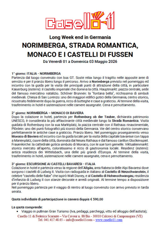 Partenza dal luogo convenuto con bus GT. Soste relax lungo il tragitto nelle apposite aree di servizio e per il pranzo libero lungo il percorso. Arrivo a Norimberga previsto nel pomeriggio ed incontro con la guida per la visita dei principali punti di attrazione della città, in particolare Kaiserburg (esterni): il castello imperiale che domina la città. Hauptmarkt: piazza centrale, sede del famoso mercatino natalizio. Schöner Brunnen: la ''fontana bella'', ricchissima di simboli medievali. Chiesa di San Lorenzo: uno dei maggiori edifici gotici della Germania, centro storico, ricostruito fedelmente dopo la guerra, ricco di botteghe e case a graticcio. Al termine della visita, trasferimento in hotel e sistemazione nelle camere assegnate. Cena e pernottamento.