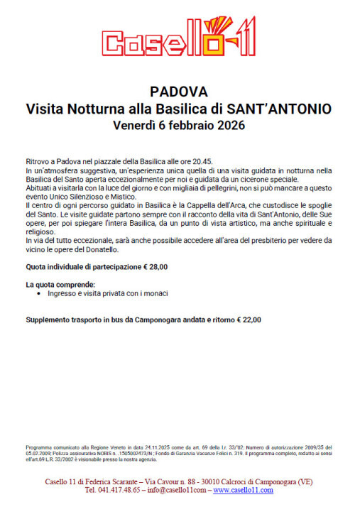 Ritrovo a Padova nel piazzale della Basilica alle ore 20.45.