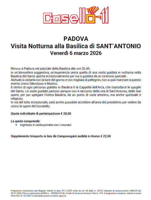 Ritrovo a Padova nel piazzale della Basilica alle ore 20.45.