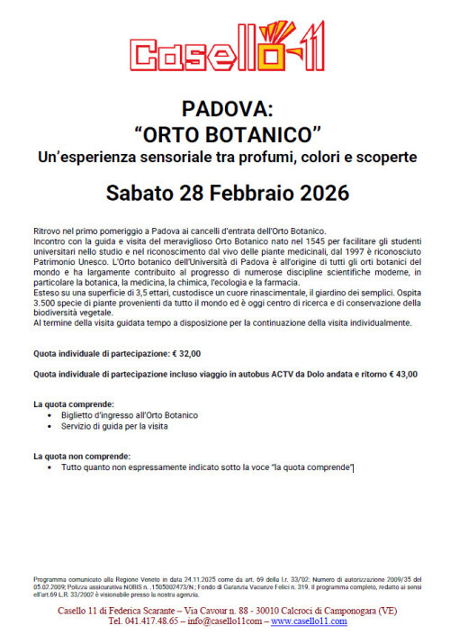 Ritrovo nel primo pomeriggio a Padova ai cancelli d’entrata dell’Orto Botanico. Incontro con la guida e visita del meraviglioso Orto Botanico nato nel 1545 per facilitare gli studenti universitari nello studio e nel riconoscimento dal vivo delle piante medicinali, dal 1997 è riconosciuto Patrimonio Unesco. L’Orto botanico dell’Università di Padova è all’origine di tutti gli orti botanici del mondo e ha largamente contribuito al progresso di numerose discipline scientifiche moderne, in particolare la botanica, la medicina, la chimica, l’ecologia e la farmacia. Esteso su una superficie di 3,5 ettari, custodisce un cuore rinascimentale, il giardino dei semplici. Ospita 3.500 specie di piante provenienti da tutto il mondo ed è oggi centro di ricerca e di conservazione della biodiversità vegetale. Al termine della visita guidata tempo a disposizione per la continuazione della visita individualmente.