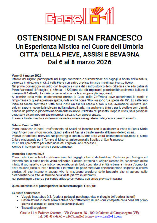 Un viaggio tra arte, spiritualità e tradizioni umbre: da Città della Pieve, patria del Perugino e dello zafferano, ad Assisi, con la visita dei suoi luoghi più sacri e l’ingresso prenotato all’ostensione del corpo di San Francesco. Completano l’esperienza il fascino medievale di Bevagna e i sapori locali degustati lungo il percorso.