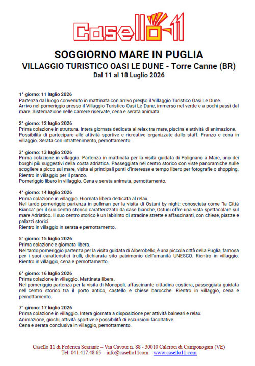 Prima colazione in villaggio. Partenza in mattinata per la visita guidata di Polignano a Mare, uno dei borghi più suggestivi della costa adriatica. Passeggiata nel centro storico con viste panoramiche sulle scogliere a picco sul mare, visita ai principali punti d’interesse e tempo libero per fotografie o shopping. Rientro in villaggio per il pranzo. Pomeriggio libero in villaggio. Cena e serata animata, pernottamento.