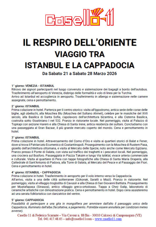 Ritrovo dei signori partecipanti nel luogo convenuto e sistemazione dei bagagli a bordo dell’autobus. Trasferimento all’aeroporto di Venezia, disbrigo delle formalità e volo di linea per la Turchia. Arrivo ad Istanbul ed accoglienza in aeroporto. Trasferimento in albergo e sistemazione nelle camere assegnate, cena e pernottamento.