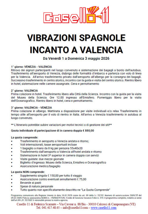 Ritrovo dei signori partecipanti nel luogo convenuto e sistemazione dei bagagli a bordo dell’autobus. Trasferimento all’aeroporto di Venezia, disbrigo delle formalità d’imbarco e partenza con volo di linea per la Valencia. All’arrivo trasferimento privato dall’aeroporto all’albergo per la consegna dei bagagli. Successivo trasferimento in centro storico, incontro con la guida e visita del centro storico. Rientro libero in hotel, sistemazione nelle camere assegnate. Cena e pernottamento