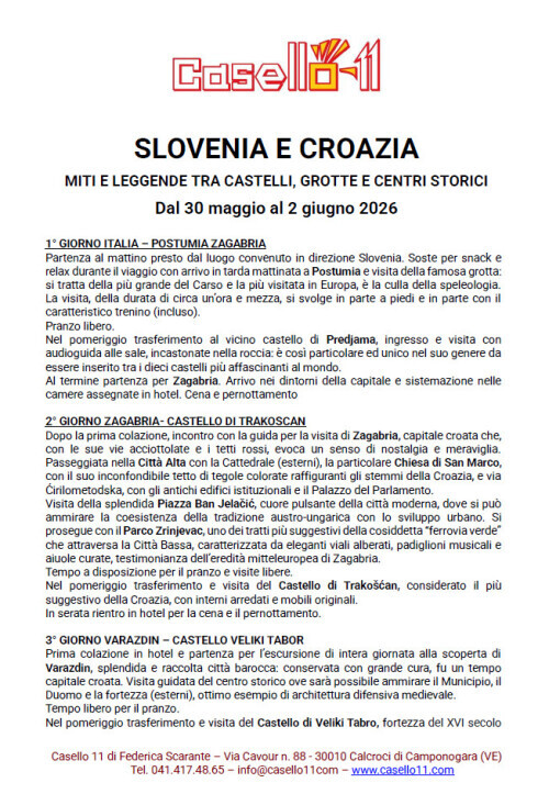 • Biglietti d’ingressi: Grotte di Postumia e Castello di Predjama, Castello di Varazdin, Castello di Trakoscan, Castello di Veliki Tabor
