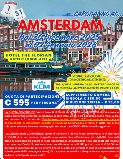 - Voli KLM diretti da : VENEZIA AMSTERDAM e viceversa in classe economica compreso 01 bagaglio in stiva max. 23 kg. e 01 bagaglio a mano max. 12 kg. a persona;