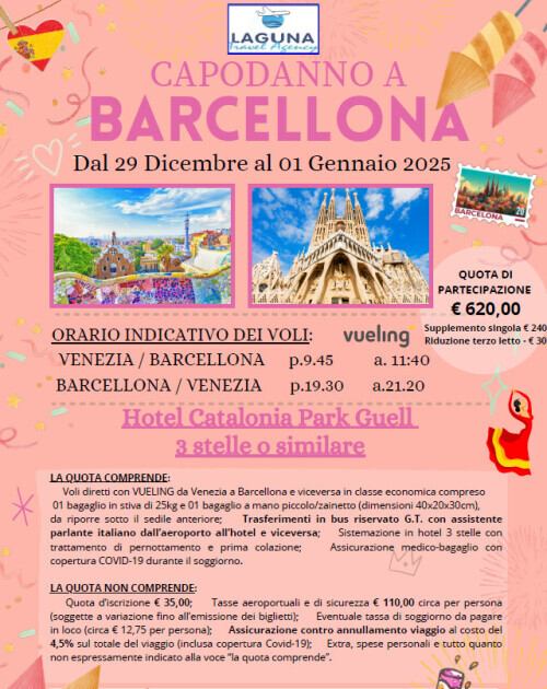 - Voli diretti con VUELING da Venezia a Barcellona e viceversa in classe economica compreso 01 bagaglio in stiva di 25kg e 01 bagaglio a mano piccolo/zainetto (dimensioni 40x20x30cm),da riporre sotto il sedile anteriore;