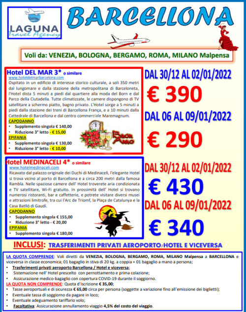 LA QUOTA COMPRENDE: • Voli diretti da VENEZIA, BOLOGNA, ROMA a BARCELLONA e viceversa in classe economica; 01 bagaglio a mano di 10 kg.+ 01 borsa piccola; • Trasferimenti privati aeroporto Barcellona / Hotel e viceversa; • Sistemazione nell’ Hotel prescelto con pernottamento e prima colazione; • Assicurazione medico-bagaglio con copertura COVID-19 durante il soggiorno.