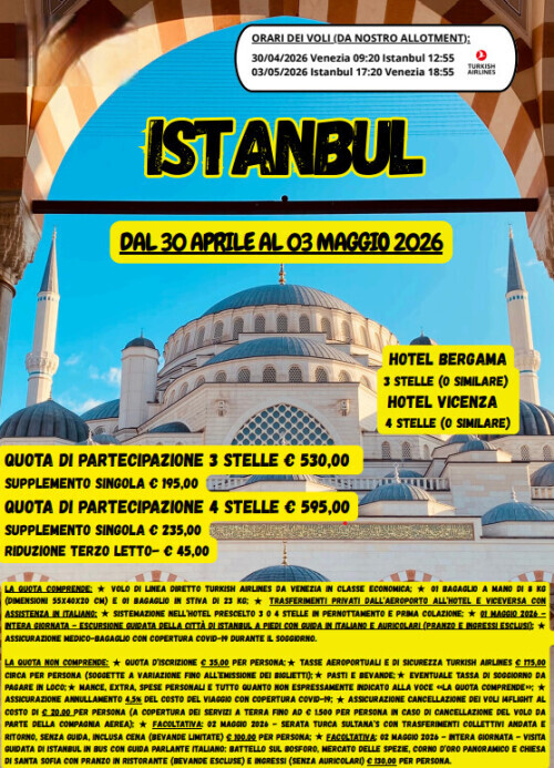 - 02 Maggio 2026 - FACOLTATIVA € 130,00 per persona - VISITA GUIDATA IN ITALIANO: SANTA SOFIA – MERCATO DELLE SPEZIE – BOSFORO CON BATTELLO (pubblico) – CORNO D’ORO PANORAMICO. INTERA GIORNATA IN BUS SENZA AURICOLARI PRANZO IN RISTORANTE (senza bevande) E INGRESSI INCLUSI - MINIMO 10 PERSONE