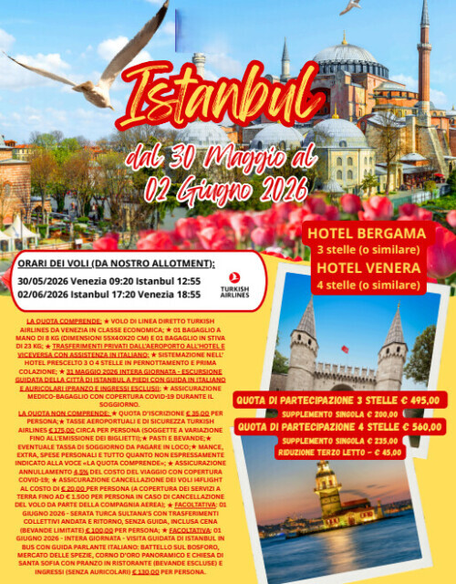 - Volo di linea diretto Turkish Airlines da VENEZIA in classe economica;